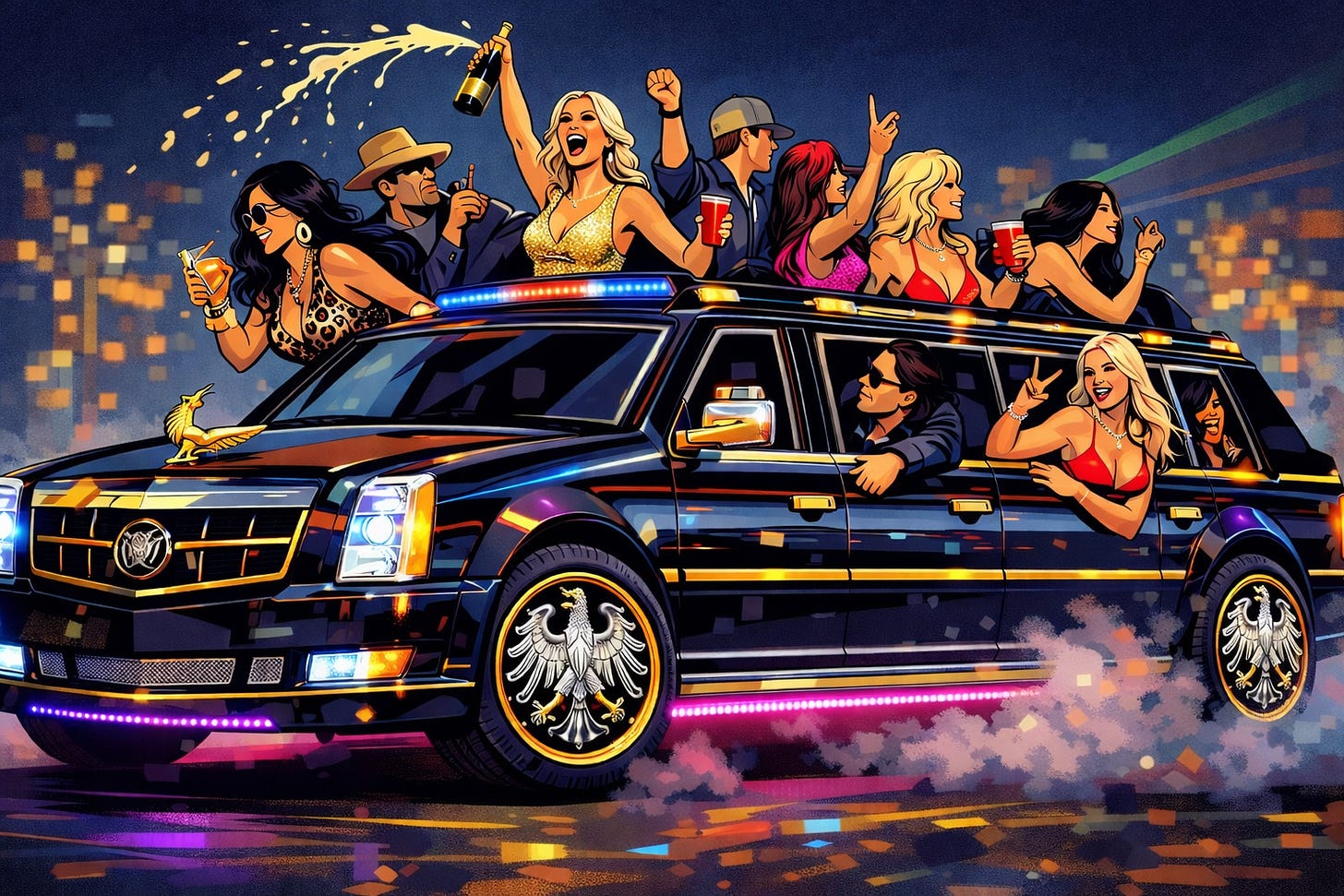 The hunting party rolls up in their game vehicle. It’s The Beast, but even more pimped out than in real life. Vance, or his likeness, is hanging out the passenger side window. Bondi and Noem are in the back. There are more MAGA Bros coming out of the sunroof.